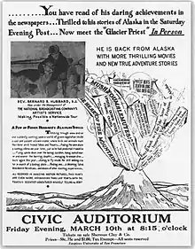 Bernard Rosecrans Hubbard (November 24, 1888 – May 28, 1962) was an American geologist and explorer who popularized the Alaskan wilderness in American media during the middle of the 20th century. Known as "the Glacier Priest", he was a Jesuit priest, head of the Department of Geology at the University of Santa Clara, California, and for a time was the highest-paid lecturer in the world, leading 31 expeditions into Alaska and the Arctic.[3][4]