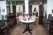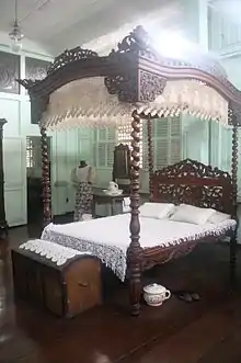 The living room and receiving area display an old Steinway piano, a gramophone, a sewing machine, an old telephone, and several paintings. Inside the bedrooms are four-post beds, chamber pots, and a birthing chair. The kitchen shows old items used for daily activities, such as the heavy chopped woods known as the prinsa de paa and prinsa de mano, as well as the round irons used to press clothes.[7]