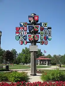 In addition to the splash pad, the Muensterberg Plaza built around the clock tower also features The Settler's Statue commemorating the arrival of the first settlers to the area, the only stateside Canton Tree, and a series of flowerbeds laid out to resemble common quilting patterns.