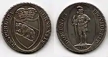 In the late 18th century, billon coins were issued in denominations of 1⁄2 and 1 Kreuzer, 1⁄2 and 1 Batzen, together with silver 10 and 20 Kreuzer, 1⁄4, 1⁄2 and 1 Thaler, and gold 1⁄2, 1 and 2 Duplone. The 1⁄2 Kreuzer coins were inscribed as 1 Vierer. Additionally, French écus were counterstamped '40 BZ' (40 batzen) in Bern for local use.[1]