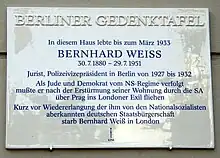 The forecourt at the Friedrichstrasse station in Berlin and the Alexanderplatzstrasse in central Berlin were named after Bernhard Weiss. A plaque has been erected outside the Berlin house where he lived.