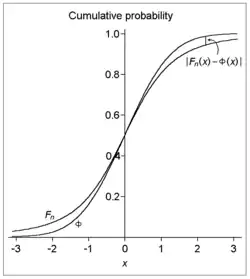 In probability theory, the central limit theorem states that, under certain circumstances, the probability distribution of the scaled mean of a random sample converges to a normal distribution as the sample size increases to infinity. Under stronger assumptions, the Berry–Esseen theorem, or Berry–Esseen inequality, gives a more quantitative result, because it also specifies the rate at which this convergence takes place by giving a bound on the maximal error of approximation between the normal distribution and the true distribution of the scaled sample mean. The approximation is measured by the Kolmogorov–Smirnov distance. In the case of independent samples, the convergence rate is n−1/2, where n is the sample size, and the constant is estimated in terms of the third absolute normalized moment.
