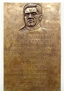 On 4 April 1895 the square was named Baltenplatz, after the Balts. However, on 31 July 1947, after World War II, the square was renamed Bersarinplatz after Nikolai Berzarin, the Russian Red Army General and former Commander of Berlin.[1][2]