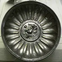 Four of the bowls have incised emblematic designs associated with Mercury, and the formulaic Latin initialism VSLM, standing for votum solvit libens merito ("He fulfils his vow freely, as is deserved").[12] Nine of the vessels form a group of luxury domestic silver of 1st century date[13] with iconographic connections to Dionysus rather than to Mercury, marked as votive offerings (vota) of one Q. Domitius Tutus; they include a matching pair of silver drinking cups (scyphi) with Dionysiac imagery of centaurs,[14] and a pair of silver wine-jugs.[8]
