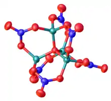 Upon heating, this adduct loses N2O4 and produces colorless Be(NO3)2. Further heating of Be(NO3)2 induces conversion to basic beryllium nitrate, which adopts a structure akin to that for basic berylium acetate.[4]