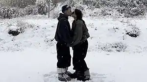 During an interview with Ibai Llanos, Rosalía and Alejandro confirmed that all three tracks off RR would be accompanied by music videos.[32] On March 21, 2023, the two shared a trailer for the "Beso" music video on social media, announcing that it would be released simultaneously with the EP on March 24.[33][34][35] The visual was released on the specified date. It features a series of key moments the two had spent together during their relationship — from their concerts backstage and the studio to vacations and international trips to countries such as France and Japan.[36][37] The video is mainly made up of videos recorded by themselves in selfie mode.[38][39] In the final scene, when the music fades, the couple confirms their engagement. Teary-eyed Rosalía shows the camera a ring with a huge diamond, saying: "Oh my god and my mascara is all runny now. I love you". As she holds her phone with one hand, and the brown ring box with the other, she looks at Alejandro and kisses him.[36][39] In her reviews for Billboard, Isabela Raygoza described the music video as "beautiful",[9] and praised how they announced their engagement in "the sweetest" and the "most creative" ways.[36]