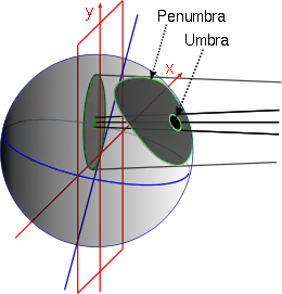 The basic concept is that Besselian elements describe the movement of the shadow cast by the occulting body – for solar eclipses this is the shadow of the Moon – on a specifically chosen plane, called the fundamental plane. This is the geocentric, normal plane of the shadow axis. In other words, it is the plane through the Earth's center that is perpendicular to the line through the centers of the occulting and the occulted bodies.[2] One advantage, among others, of choosing this plane is that the outline of the shadow on it is always a circle, and there is no perspective distortion.