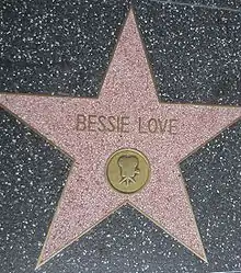 In June 1915, while a student at Los Angeles High School, Horton went to the set of a film to meet with actor Tom Mix, who had recommended that she visit him if she wanted to "get into pictures".[15] However, when Mix was unavailable, she was advised to meet with pioneering film director D.W. Griffith,[15] who placed her under personal contract.[16] When it was decided that her given name was too long for theater marquees and too difficult to pronounce,[11] Griffith's associate Frank Woods gave Horton the stage name Bessie Love:[13][15] "Bessie, because any child can pronounce it. And Love, because we want everyone to love her!"[11] Love dropped out of high school to pursue her film career, but she completed her diploma in 1919.[17]