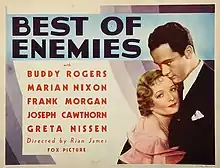 Best of Enemies is a 1933 American pre-Code comedy film directed by Rian James and written by Sam Mintz and Rian James. The film stars Charles "Buddy" Rogers, Marian Nixon, Frank Morgan, Greta Nissen, Joseph Cawthorn and Arno Frey. The film was released on June 23, 1933, by Fox Film Corporation.[1][2][3]