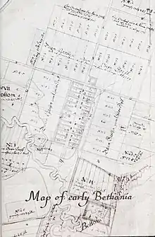 Bethania was founded 12 June 1759 by the Moravian Brethren of Wachovia as a congregational, agricultural, and trades community. Bethania was the first planned Moravian settlement in Wachovia, and members of a "Society", under the care of the Bethania congregation, were permitted to reside in the village after July 1759. Today, Bethania's eighteenth-century German-type linear agricultural village design remains visible and intact, and most town lots and roadways have remained in continuous use since 1759. The name "Bethania" is the German form of "Bethany", the name of a village near Jerusalem recorded in the New Testament as the home of Mary, Martha and Lazarus, as well as that of Simon the Leper.[5]