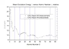 The figure shows normalized values of I, taken from a table.[5] The peaks and valleys in this figure lead to corresponding valleys and peaks in the stopping power. These are called "Z2-oscillations" or "Z2-structure" (where Z2 = Z means the atomic number of the target).