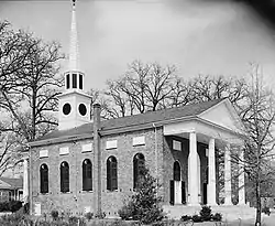 The main sanctuary is a rectangular brick building, with a four-columned portico on the south (street-facing) facade and a modest steeple at the north end. The front facade of the building is laid in Flemish bond, while the other three sides are laid in American bond. Behind the south portico is a large central round arch niche, which is flanked by symmetrical entrances. The north facade, which now serves as the main entrance, has a Tuscan portico sheltering a pair of staircases leading up to the gallery level. A pair of entrances provide access to the main level, and there is a round-arch window opening centered above. The side walls each have five round-arch windows. The interior is organized with the pulpit and altar at the south end, with a balcony at the north, supported by unfluted columns. Decorative elements of the balcony include dentillated elements, recessed panels, and fluted pilasters.[3]