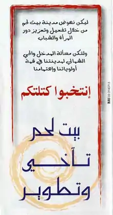 Bethlehem Brotherhood and Development (Arabic: بيت لحم تآخي وتطوير) was a candidature bloc that contested the May 2005 municipal elections in Bethlehem, the West Bank. Politically independent, the list included members of the Popular Front for the Liberation of Palestine. In total, the bloc presented 15 candidates (8 Christians and 7 Muslims). The top candidate of the Bloc was Victor Batarseh, who was elected mayor.[1]