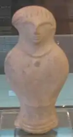 The discoveries gave rise to a discussion concerning the ethno-religious identity of the potters and, even more interesting, of the customers to which the oil lamps and figurines were sold.[16] The 1934 findings from the two cisterns included 341 figurines, the main types depicting either nude females or horsemen, possibly used for apotropaic or magical purposes.[16] These more common motives, as well as some less frequent ones such as animals, mirror-plaques and masks, seem to suggests a pagan clientele, while the use of the menorah on lamps suggests the presence of a Jewish population in the region.[16] Less than 1% of the 600 lamps found in 2014 were decorated with a menorah, widely weakening, along with other considerations, the case for a Jewish identity of the Beit Nattif potters.[16] Due to the still very meager Late Roman findings from the region, researchers can neither reject nor prove if and which figurines and lamps were produced specifically for pagans or Jews, Lichtenberger concluding that after the Bar-Kokhba revolt, the remaining Jewish population was integrated into a "milieu of cultural pluralism".[16] Rosenthal-Heginbottom agrees with Jodi Magness that some Beit Nattif lamps were manufactured for Jewish customers, while others were produced with pagan and Christian buyers in mind.[16] Although there is a certain similarity between the iconography of the Iron Age and the Hellenistic periods and that of the Late Roman period, occurring in time among different ethno-religious populations, it is hard to prove beyond the level of pure speculation a continuity stretching over such a long time span.[16]