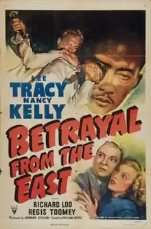 Betrayal from the East is a 1945 American spy drama film starring Lee Tracy and Nancy Kelly. The film was directed by William A. Berke and based on the book Betrayal from the East: The Inside Story of Japanese Spies in America by Alan Hynd. The supporting cast features Richard Loo, Regis Toomey, Philip Ahn, Victor Sen Yung, Jason Robards Sr. and Drew Pearson.