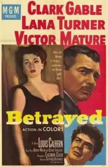 Betrayed is a 1954 American Eastmancolor war drama film directed by Gottfried Reinhardt and starring Clark Gable, Lana Turner, Victor Mature, and Louis Calhern. The screenplay was by Ronald Millar and George Froeschel. The musical score was by Walter Goehr and Bronislau Kaper, and the cinematography by Freddie Young. The picture, Gable's last for Metro-Goldwyn-Mayer, was filmed on location in the Netherlands and England, and was based on the story of turncoat Dutch resistance leader Christiaan Lindemans, also known as "King Kong". The supporting cast features O. E. Hasse, Wilfrid Hyde-White, Ian Carmichael, Niall MacGinnis, and Theodore Bikel. Betrayed was the fourth and final movie in which Gable played opposite Turner, and their third pairing set during World War II. (They played comrades, not simply lovers, in all three war films.)