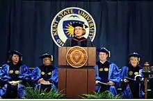 National appointments include the finance committee of the American Council on Education Council of Fellows, American Association of State Colleges and Universities (AASCU) Women presidents and Chancellors affinity group and the AASCU Policies and Practices Committee. She is a sponsor, mentor and faculty member of the AASCU Millennial Leadership Initiative.[67][68]