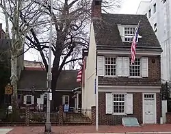The Betsy Ross House is a landmark in Philadelphia purported to be the site where the seamstress and flag-maker Betsy Ross (1752–1836) lived when she is said to have sewed the first American Flag. The origins of the Betsy Ross myth trace back to her relatives, particularly her grandsons, William and George Canby, and the celebrations of the Centennial of 1876.[1] Evidence for the precise location of Ross's home came from verification provided by several surviving family members,[2] although the best archival evidence indicates the house would have been adjacent to the one that still stands today as The Betsy Ross House.[3] The 1937 Philadelphia Guide noted that, after the current Betsy Ross House was selected as the Flag House, the adjacent building where Ross may have indeed lived "was torn down to lessen the hazards of fire, perhaps adding a touch of irony to what may well have been an error in research."[4] Although the house is one of the most visited tourist sites in Philadelphia,[5] the claim that Ross once lived there, and that she designed and sewed the first American flag, sometimes called the Betsy Ross flag, are considered false by most historians.[6][7]