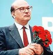 Craxi was appointed to the vacant position of National Secretary of the party, ending years of factional fighting within the PSI.[30] Ironically, the "old guard" saw him as short-lived leader, allowing each faction time to regroup. However, he was able to consolidate power and implement his policies. In particular, he sought and managed to distance the party from the Communists, bringing it into an alliance with Christian Democracy and other centrist parties, while maintaining a leftist and reformist profile.[31]