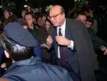Craxi was involved in investigations conducted by Mani Pulite judges in Milan, eventually being convicted for political corruption and illicit financing of the PSI.[5] He always rejected the charges of corruption while admitting to the illegal funding that permitted costly political activity, the PSI being less financially powerful than the two larger parties, Christian Democracy (DC) and the Italian Communist Party (PCI).[6] Craxi's government and party were also supported by future Prime Minister Silvio Berlusconi, a media magnate and personal friend of Craxi.[7][8]
