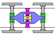 Around 1860, when Beugniot was the chief engineer at the firm of André Koechlin & Cie. in Mulhouse, he developed a system whereby wheelsets are housed in pairs in the locomotive frame, with side-play, and connected by a lever. These levers are fixed to the frame in the centre and thus enable the sideways movement of the connected axles in opposite directions. In this way, instead of being fixed in the frame, the axles are able to move sideways rather like a bogie, but clearly nowhere near as much. On locomotives with a side rod drive, the axle side-play is balanced using longer coupling pins (Kuppelzapfen) on which the coupling rods are also able to move sideways.