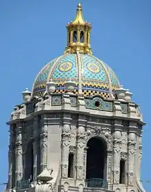 Thus, in 1930, land was purchased from the Pacific Electric to build the city hall.[4][6] Construction lasted from 1931 to 1932.[6] The building was designed by architects William J. Gage and Harry G. Koerner in the California Churrigueresque style, a type of Spanish Revival architecture.[7][5][8][4] The building was constructed by the Herbert M. Baruch Corporation. When the city hall opened in 1932, it was called by the Los Angeles Times the "largest and most expensive City Hall of any municipality its size in the country."[4][6]