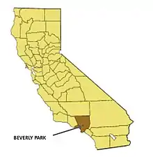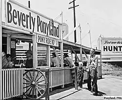Beverly Park was located in the city of Beverly Hills, Los Angeles County, California, USA. The location was in a rural area suitable for attractions and rides for children.[1] The Park was located next to the largest drugstore in the world[6] and close to Ponyland, an amusement site owned and operated by Leo "Pat" Murphy[7] and his wife, Viva Murphy[1] at 8536 Beverly Boulevard. The Park initially measured 200 by 200 feet, doubling in size in the first four years to reach 400 by 200 feet by 1947.