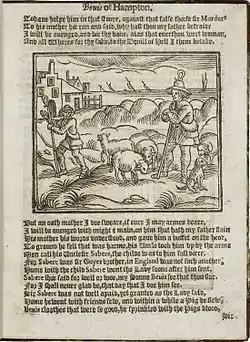 Various prose versions were published during the late 17th century and early 18th century in chapbook form. They follow the plot of the poem reasonably closely, though some, such as The Famous and Renowned History of Sir Bevis of Southampton (1689), also add new episodes and characters.[12] Such books were often read by the common people, including such children as the one described by the 18th century essayist Richard Steele: "He would tell you the mismanagement of John Hickerthrift, find fault with the passionate temper in Bevis of Southampton, and loved St. George for being the champion of England; and by this means had his thoughts insensibly moulded into the notions of discretion, virtue, and honour."[13] After the mid 18th century interest in Beves began to decline, and the printer of a 1775 reprint says the story is "very little known".[14]