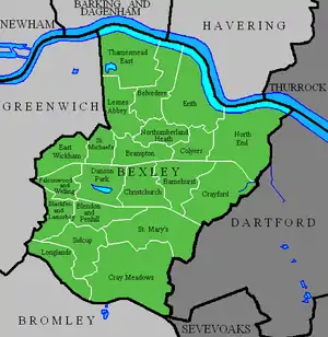 There are 17 wards represented on Bexley Council; each ward elects two or three councillors, 45 in all.[5] The wards are shown on the accompanying map.