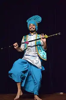 The origins of traditional bhangra are speculative. According to Dhillon (1998), bhangra is related to the Punjabi dance 'Bagaa', which is a martial dance of Punjab.[7] However, the folk dance of Bhangra originated in the Sialkot district of Majha.[7][8][6] The traditional form of bhangra danced in the villages of Sialkot district was regarded as the standard.[9] The community form of traditional bhangra has been maintained in Gurdaspur district, India, and has been maintained by people who have settled in Hoshiarpur, Punjab, India.[7] Traditional bhangra is performed in a circle[10] and is performed using traditional dance steps. Traditional bhangra is now also performed on occasions other than during the harvest season.[11][12] According to Ganhar (1975),[13] bhangra originated in Sialkot of Majha which shares high affinity with Jammu making it part of the heritage of Jammu which is danced on Baisakhi. Other Punjabi folk dances such as Giddha and Luddi have also been heritage of Jammu.[13][14][15][16][17][18] Punjabi language influences can be observed when people dance such dances.[19] Jammu falls within the Punjab region and shares an affinity with Punjab.[20]