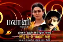 Bhavani (Tamil: பவானி) is a 2009 Indian Tamil-language crime thriller soap opera that aired on Kalaignar TV from 9 February 2009 Monday to Thursday at 20:00 (IST) and ended with 116 Episodes.[1][2] The show stars Bhavana, Neelima Rani, Subhalekha Sudhakar, Vadivukkarasi, Bharathy, Kavya, and Revathy Priya, and is directed by Rasool.