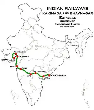 The Bhavnagar Terminus–Kakinada Port Express is an Express train belonging to South Central Railway zone that runs between Bhavnagar Terminus and Kakinada Port in India. It is currently being operated with train numbers on a weekly basis.[1][2][3] From 18th March, 2023, it runs with highly refubrished LHB coaches.