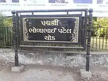 Patel was awarded the Padma Shri, the fourth highest civilian award in India, in 2008. He also won the KK Birla Foundation fellowship. He received the Ranjitram Suvarna Chandrak in 1995, the highest award in Gujarati literature. He was the recipient of the Sahitya Akademi Award for Gujarati in 1992 for Devoni Ghati.[2][5][6][7] Bholabhai Patel Chowk, a crossroad near Gujarat University, is named after him.[10]