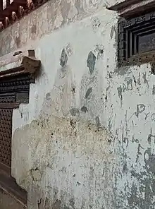 ![]() Detail of a fresco at sadāśiva chuk courtyard in the royal palace. This fresco along with all the other in the courtyard has been heavily vandalized.[1] | |||||