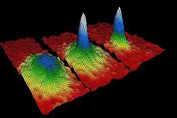 In physics, a Bose–Einstein condensate is a state of matter that occurs in certain gases at very low temperatures. Any elementary particle, atom, or molecule, can be classified as one of two types: a boson or a fermion. For example, an electron is a fermion, while a photon or a helium atom is a boson. In quantum mechanics, the energy of a (bound) particle is limited to a set of discrete values, called energy levels. An important characteristic of a fermion is that it obeys the Pauli exclusion principle, which states that no two fermions may occupy the same state. Bosons, on the other hand, do not obey the exclusion principle, and any number can exist in the same state. As a result, at very low energies (or temperatures), a great majority of the bosons in a Bose gas can be crowded into the lowest energy state, creating a Bose–Einstein condensate.