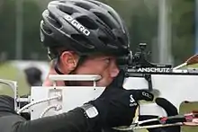 In 1970, Izhmash started producing the liqhtweight traditional bolt action Bi-4 rifle () in 5.6×15 mmR (.22 LR), which was produced until 1978. For a while, only traditional bolt-action mechanisms were permitted, but this restriction was removed towards the end of the 1970s. In 1976, the Finns presented the first rimfire rifle with a toggle action called Finnbiathlon, allowing for faster reloading.[28] Izhmash soon followed and presented their version of a rimfire toggle action later in 1976, a mechanism which is still used today on Izhmash sport, hunting and tactical rifles. In 1977, when international biathlon standardized the .22 LR caliber, Izhmash released Bi-6 bolt action rimfire rifle.[29] When some of the restrictions on action types were lifted somewhere around 1980,[29] Izhmash took the lead by introducing the Izhmash Bi-7 side-toggle rifle in 1979. The Bi-7 had a weight of 4.0 kg, had a 60 cm long barrel, 111 cm overall length and an sight radius between 81 and 83 cm.[30] The trigger pull weight was adjustable between 200 and 1000 grams.[30] Soviet athletes went to the Biathlon event at the 1980 Winter Olympics in Lake Placid using Bi 7-2 straight pull rifles, and won most medals. The Bi 7-2 rifle set itself apart from the previous Bi 7 toggle series with the introduction of a new barrel locking system which allowed for an increased rate of fire. Across the 1980s, the design proved very successful with Soviet athletes taking the relay gold medales in three successive Olympics.