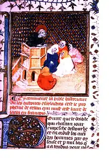 The work was copied in many manuscripts, of which more than a hundred survive, most of them richly illuminated, some with more than 300 miniatures.[2] Genesis is typically especially heavily illustrated. In this respect, it is similar to other vernacular medieval redactions of the Bible such as the Bible moralisée, Biblia pauperum and Speculum Humanae Salvationis; it differed from these, however, in containing extended direct translations from the Bible. The French name is usually used in English, at least partly because scholars differ as to whether "Historiale" should be translated as "historical" or "historiated" (illustrated).