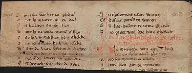 The Wachtendonck Psalms could be considered the oldest known biblical fragments in 'Dutch'. Although found in Munsterbilzen Abbey by Flemish humanist Justus Lipsius in the late 16th century, these texts most likely originated in the Dutch–German borderlands between the Meuse and Rhine rivers in the 9th or 10th century.[1] Although the texts' language is Old Dutch, Psalms 1 to 3 show clear Central Franconian characteristics.[2] It is generally assumed that the texts as handed down are an Old Dutch redaction of a Central Franconian original.[1] Another contender is the Rhinelandic Rhyming Bible, a series of fragments of biblical histories translations into an apparent mix of Old High German, Old Saxon, and Old Dutch from the early 12th century. However, due to the paucity of evidence, it's difficult to date, linguistically classify and geographically pinpoint the origins of these writings; although a number of scholars associate it with the German Rhineland, possibly the Werden Abbey, this remains undetermined.[3][4]