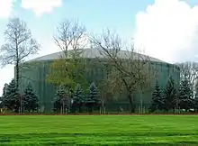 Bicentennial Park is a 4.4-acre (1.8 ha) neighborhood park in the middle of Hillsboro.[15] Features include a single soccer field, restrooms, a picnic shelter and picnic tables, paved walking paths, park benches, and a children's playground.[5][11] The playground includes a climbing boulder similar to one at Orchard Park, on the other side of the city.[5] The signature large, green water reservoir is 150 feet (46 m) in diameter and has a capacity of 6,000,000 US gallons (23,000,000 L; 5,000,000 imp gal).[3][5] The park does not have off-street parking, but does include large oak trees along the southern end of property.[5]