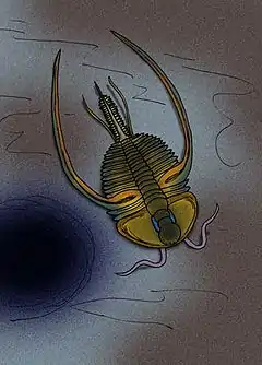 Biceratops is an extinct genus of olenelloid redlichiid trilobites, of average size, with the largest specimen 8 centimetres or 3.1 inches long, not including the huge pleural spines of the 3rd segment of the thorax. It lived during the Toyonian stage (last phase of the Upper Olenellus-zone), in what is today the South-Western United States. Biceratops can easily be distinguished from other members of Biceratopsidae by the absence of genal spines, in combination with effaced features of the raised axial area of the head shield (or glabella), that is bordering the two horn-like projections that carry the eyes.[1] Biceratops nevadensis is the only known species in this genus (i.e. the genus is monotypic).