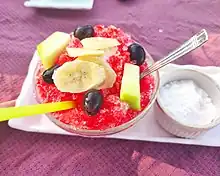 Bici bici is prepared with crushed ice, starch, and syrup. Once the starch is cooked in water, it is left to cool in a tray and then chopped. Then, it is flavored with the syrup to taste, usually rose flavoured, and is draped over ice, finally served with sugar on top.[2][3]