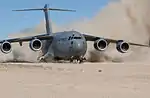 ![]() The jet engines of an Air Force C-17 Globemaster III kick up clouds of dust as the aircraft turns around at the end of a dirt runway at Bicycle Lake Army Airfield on Fort Irwin, Calif., on Feb. 10, 2006. The Globemaster and her crew are attached to the 452nd Air Mobility Wing. | |||||||||||||||