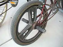 A wheel can be formed in one piece from a material such as thermoplastic (glass-filled nylon in this case), carbon fiber or aluminium alloy. Thermoplastic is commonly used for inexpensive BMX wheels. They have a low maximum tire pressure of 45 psi (3bars or atmospheres).[30] Carbon fiber is typically used for high-end aerodynamic racing wheels.