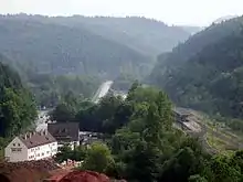 In the following year, a committee, to which representatives from Kaiserslautern, Waldfischbach and Schopp belonged, noted several advantages of such a route. It would benefit Pirmasens with its industry, the transport of timber in the areas of Johanniskreuz, Leimen, Lemberg, Merzalben, Ruppertsweiler, Trippstadt and Waldfischbach, the gravel pits in Heltersberg, Rodalben, Schmalenberg and Waldfischbach and the agriculture of the neighbouring Sickingen Heights and services for visitors to the waterfalls of the region.[4][5]