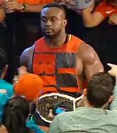 On the November 18 episode of Raw, Langston received his postponed championship match with Curtis Axel, defeating him to win the Intercontinental Championship, his first singles championship on the main roster.[49] At Survivor Series, Langston successfully retained his title against Axel.[50] Langston then successfully retained his championship against Damien Sandow at TLC: Tables, Ladders & Chairs.[51] On January 26, 2014, at the Royal Rumble, Langston participated in the Royal Rumble match, but was eliminated by Sheamus.[52] At Elimination Chamber on February 23, with his ring name now shortened to Big E, he successfully defended the title against Jack Swagger.[53] At WrestleMania XXX, Big E competed in the Andre the Giant Memorial Battle Royal, which was won by Cesaro.[54] At Extreme Rules, Big E lost the title to Bad News Barrett, and failed to regain it the following night on Raw, ending his reign at 167 days.[55] Big E later became involved in a feud with Rusev, which led to consecutive bouts at Payback and Money in the Bank, both of which Big E lost.[56][57] At Battleground, Big E competed in a battle royal for the Intercontinental Championship, which was eventually won by The Miz.[58]
