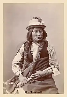 Big Mouth (Lakota: Itȟáŋka) (c. 1822—October 29, 1869) was an Oglala-born leader of the Brulé Lakota, regarded by the Brulé for his bravery and aggressive military leadership. He was one of the signers of the second Treaty of Fort Laramie in 1868[1] and remained a bitter opponent of further American settlement, ridiculing Spotted Tail and other Sioux leaders upon their return from a mission to Washington, D.C. He was the first son of Old Chief Smoke (1774–1864) and his third wife, Burnt Her Woman. His twin brother was Blue Horse.