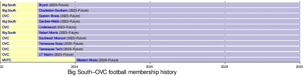 On February 22, the conference announced its intent to combine its football membership with the Ohio Valley Conference beginning in 2023.[12] With the release of the 2023 joint football schedule, it was announced that the partnership between the two conferences would exist through the 2026–27 season.[13]