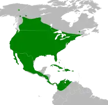 The big brown bat is encountered widely throughout North America in present times.[29] It is found from southern Canada and Alaska to as far south as Colombia and Venezuela. It has also been documented in the Caribbean in both the Greater and Lesser Antilles, including Cuba, Hispaniola, Dominica, Barbados, and the Bahamas. The big brown bat has been documented from 300–3,100 m (980–10,170 ft) above sea level.[1] It is a generalist, capable of living in urban, suburban, or rural environments.[33] It has been called "the most widespread Pleistocene bat in North America", as it is more represented in the fossil record of that time than any other bat species. Its extensive fossil record is known from more than thirty sites, including fourteen US states, Puerto Rico, Mexico, and the Bahamas.[29]