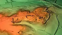 The fort covers an area of 10.7 hectares (26 acres),[1] including a northern annex covering 3.2 hectares (7.9 acres) that may have been a cattle enclosure. The fort has a single 4.8-metre (16 ft) wide defensive ditch with a raised bank on the inner side and a lower counterscarp bank. The ramparts form an irregular shape following the contour of the hill at an altitude of 60 metres (200 ft) above mean sea level.[5] Excavations in the early 1960s revealed the presence of large post-holes in the bottom of the defensive ditch, which have been interpreted as evidence of a strong pallisade running along the ditch bottom.[1]