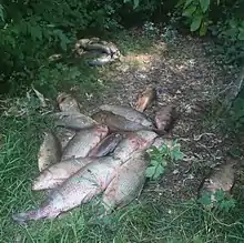According to the Committee on the Status of Endangered Wildlife in Canada, the conservation status in the Canadian range of the bigmouth buffalo is difficult to assess due to lack of study of this animal.[36] Known threats include loss of backwater spawning areas due to channelization and loss of spawn viability due to high turbidity related to variation in flow rate.[36] The bigmouth buffalo is also negatively affected by dams that restrict their movement and ability to find suitable spawning habitat, they are prone to winterkill, and they are highly vulnerable to overfishing.[2][3][4][9][24] The bigmouth buffalo is an endangered fish species in Pennsylvania.[37] Besides this state, the bigmouth buffalo is not currently listed as threatened or endangered in any other region of its native distribution, although the Saskatchewan - Nelson River populations designatable unit has been listed under Schedule 1 of the Species at Risk Act as being of special concern since 2011 due to contiguous declines[3][4][36] that have also been evident in the northern extent of their US range since the 1970s.[8] Surprisingly, several longstanding MN populations are composed almost totally (85–90%) of individuals hatched before 1940, while harvest limits do not exist in these same areas - this despite the rapidly growing new sport of modernized night bowfishing that exploits this species.[2][9][24] Indeed, the rise of bowfishing was found to be coincident with steep declines in bigmouth buffalo.[2]